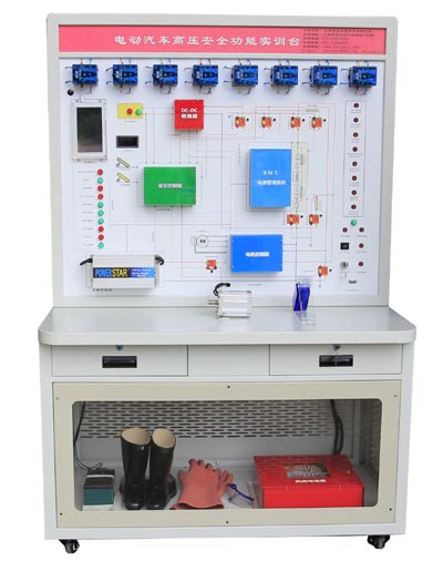 5.實訓(xùn)臺上部為系統(tǒng)電路原理圖和各系統(tǒng)的實物,實訓(xùn)桌下部安裝有低壓電源和高壓電池組,可通過透明窗口觀察鋰電池組。左側(cè)、右側(cè)后側(cè)網(wǎng)孔板通風(fēng)散熱。