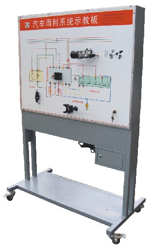 本產品選用大眾汽車雨刮系統(tǒng)實物,展示汽車雨刮系統(tǒng)的結構與原理;面板上繪有完整的雨刮系統(tǒng)的電路圖,設置有檢測端子,可通過儀器儀表檢測各種信號參數(shù)如電壓、電阻、頻率等。